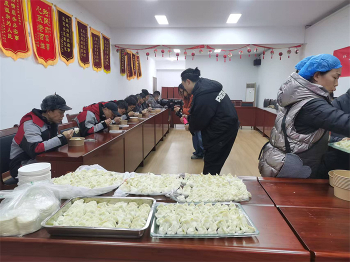 仪式举行完毕,大家移步二楼社区活动室围坐一起,边包饺子边话家常,节日氛围浓厚。热气腾腾的饺子出锅后,骑手们与社区居民和参会人员齐聚一堂,共享美味,暖意洋溢。