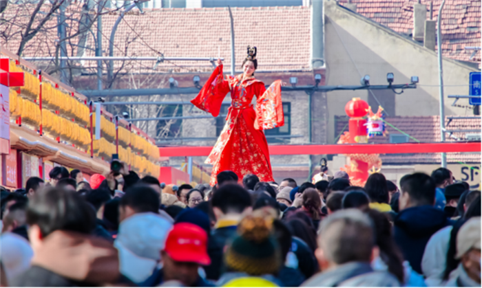 启动仪式在百年里院广兴里的铿锵鼓乐声中启幕。活动以“骐骥迎春”“跃马纳福”“蜜福颂春”三个篇章串联,既有《跃马甜心年》的青春律动,也有新民乐《万马奔腾》、京歌《悟空》的创新演绎。情景剧《幸福糖球》将青岛人阖家逛会的热闹场景搬上舞台,现场掌声与欢笑声交织,共同拉开马年新春的欢乐序章。