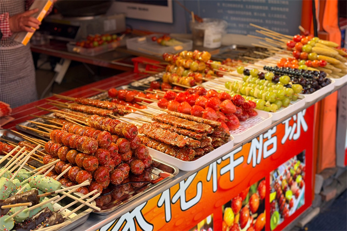 现场摊位前人头攒动:经典山楂糖球裹着晶莹糖衣,奶皮子、草莓、葡萄、巧克力香蕉等创新糖球亮眼吸睛,高家、李府、老北京、刘家花样糖球等老字号摊位前排起长队。滚圆元宵、脆甜萝卜、老青岛小吃热气腾腾,摊主麻利裹糖、翻炒,甜香混着市井吆喝,勾勒出最地道的岛城新春图景。