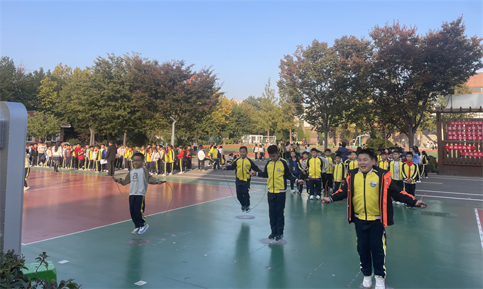 在保障学生运动时间方面,学校在原有“上午大课间,天天体育课”制度基础上,进一步优化锻炼安排,在下午第二节课后增设40分钟大课间。包括广播体操、跳绳、跑步等运动项目。学校组要求班主任老师各负其责,体育教师按年级分组值守,为学生提供专业指导,确保运动安全与锻炼效果。同时,学校还倡导“先运动、再进班”的晨练模式,鼓励清早到校的学生优先参与户外运动打卡,分区域进行不同类型运动,从小培养主动锻炼的良好习惯。