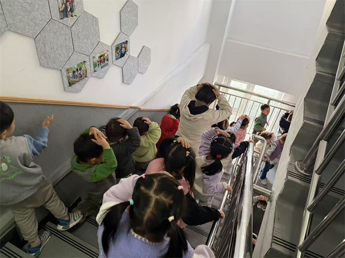 第二阶段警报响起“疏散”,各班教师迅速组织幼儿双手护头,弯腰,按照逃生路线快速有序地紧急撤离到幼儿园操场上。在撤离过程中教师们确保每位幼儿的安全,防止发生踩踏事故。