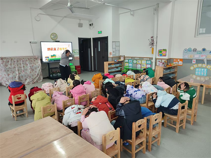 第一阶段警报响起“避震”,上午9点30演练正式开始,各班教师组织幼儿活动时,听到了第一阶段地震预警警报响起,立即进入紧急避险状态。“地震啦!大家快躲到安全区域!”孩子们在老师的指导下迅速抱头、蜷曲身体,躲到桌子底下或墙角三角安全区域。